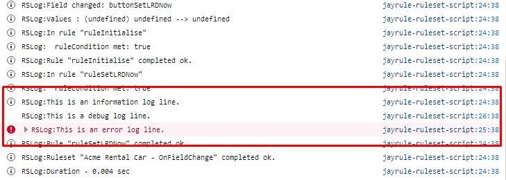 Console logging from rulesets comes prefixed with "RSLog:" and also denotes the source "jayrule-ruleset-script" on the right side (unless configured otherwise)